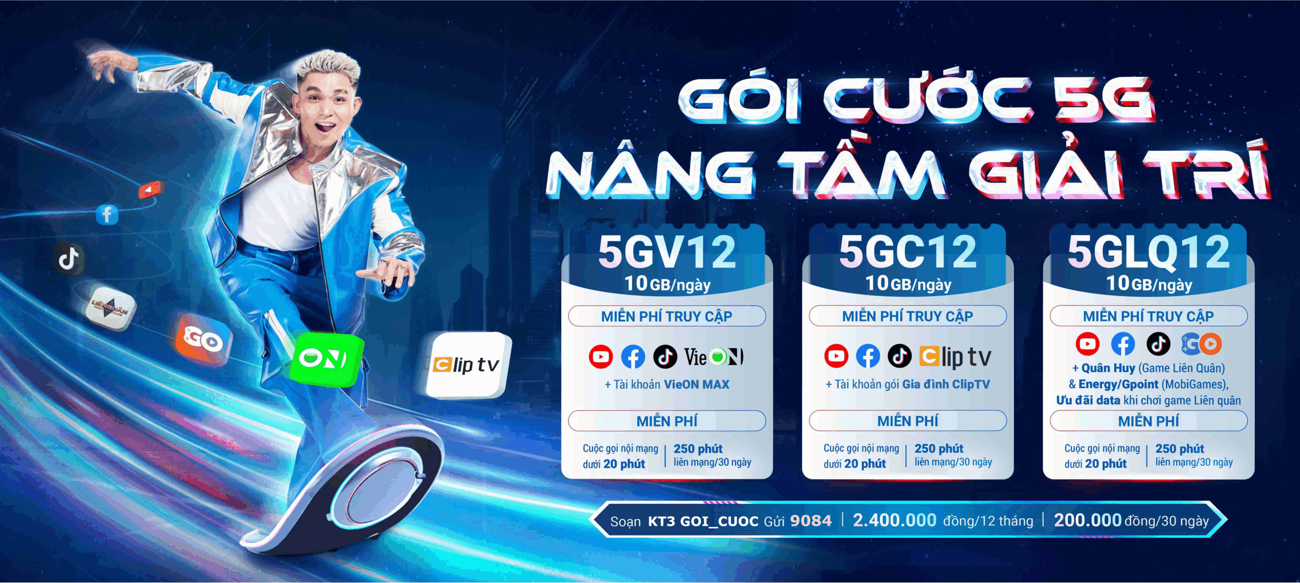 Vinaphone ra mắt các gói cước combo giải trí và dịch vụ số với dung lượng data lên đến 15 GB/ngày, cùng nhiều quyền lợi hấp dẫn: miễn phí truy cập các dịch vụ giải trí truyền hình, các ứng dụng Mạng xã hội như: VTVcab, ClipTV, VieON, Liên Quân Mobile, Youtube, Facebook, Tiktok…, gọi thoại ổn định, tốc độ truy cập mạnh mẽ, sử dụng liên tục mọi lúc mọi nơi, đăng kí dễ dàng. Các gói cước 5G của Vinaphone đáp ứng mọi nhu cầu của khách hàng!